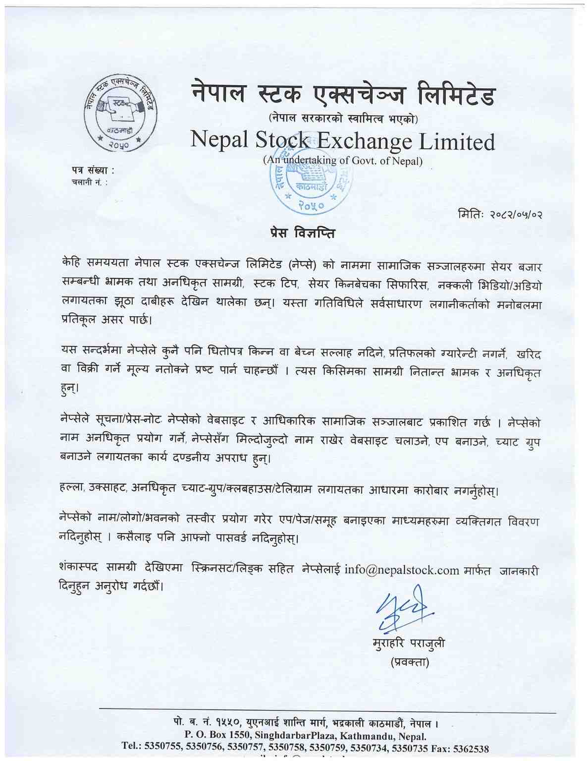 ‘केही समययता नेपाल स्टक एक्सचेन्ज लिमिटेड (नेप्से) को नाममा सामाजिक सञ्जालहरुमा सेयर बजार सम्बन्धी भ्रामक तथा अनधिकृत सामग्री, स्टक टिप, सेयर किनबेचका सिफारिस, नक्कली भिडियो र अडियो लगायतका झूठा दाबीहरु देखिन थालेका छन्। यस्ता गतिविधिले सर्वसाधारण लगानीकर्ताको मनोबलमा प्रतिकूल असर पार्छ।’,विज्ञप्तिमा भनिएको छ ।