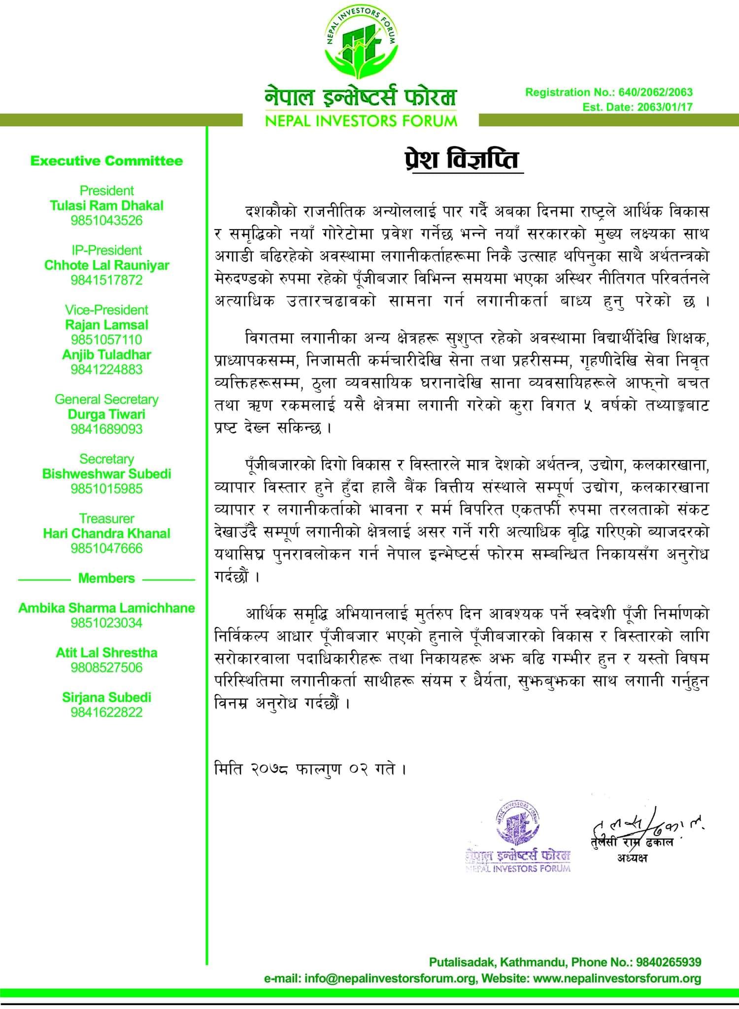 फोरमले आर्थिक समृद्धि अभियानलाई मूर्तरुप दिन आवश्यक पर्ने स्वदेशी पूँजी निर्माणको निर्विकल्प आधार पूँजीबजार भएको हुनाले पूँजीबजारको विकास र विस्तारको लागि सरोकारवाला पदाधिकारीहरू तथा निकायहरू अझ बढि गम्भीर हुनको लागि अनुरोध गरेको छ । यस्तो विषम परिस्थितिमा लगानीकर्तालाई संयम र धैर्यता अपनाएर सुझबुझका साथ लगानी गर्न पनि फोरमले अनुरोध गरेको छ ।