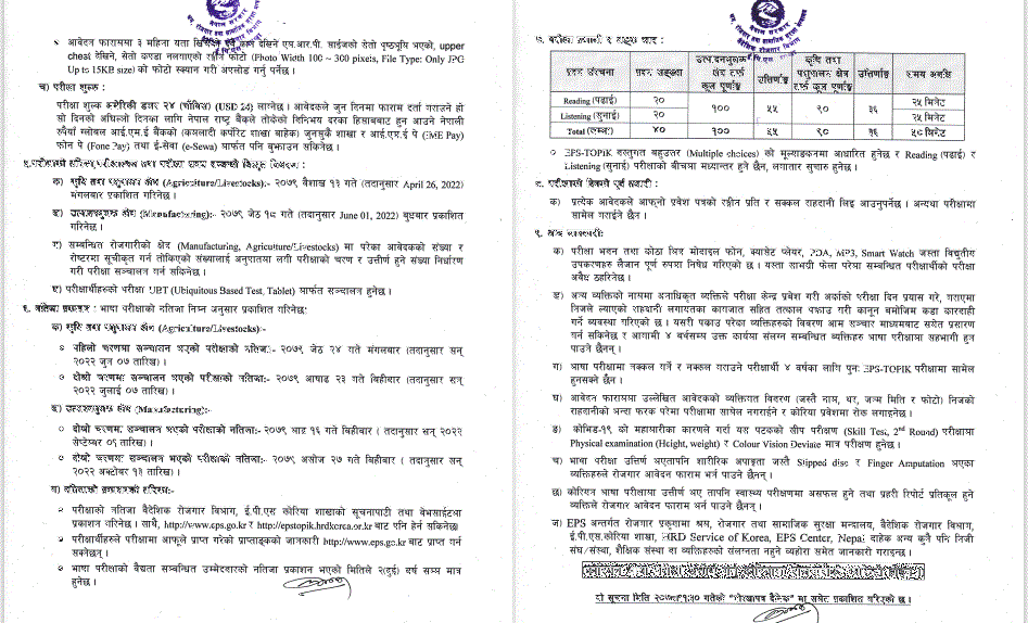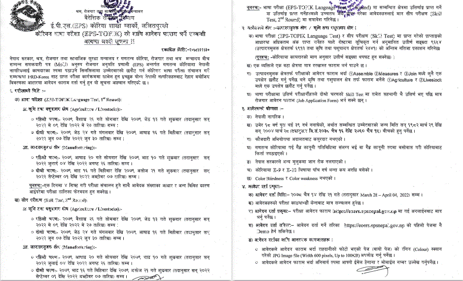 भाषा परीक्षामा सहभागी हुन आगामी चैत १४ देखि २१ गतेसम्म आवदेन फारम भर्न सक्ने शाखाले जनाएको छ । आवेदन फाराम EPS | EPS Korea Section was established under Government of Nepal, Ministry of Labour and Employment, Department of Foreign Employment on 26th July 2007 (epsnepal.gov.np) मार्फत भर्न सकिनेछ । परीक्षामा सहभागीको भाषा परीक्षाका साथै सीप परीक्षण पनि हुनेछ । आवेदन फारम शुल्क अमेरिकी डलर २४ लाग्नेछ ।