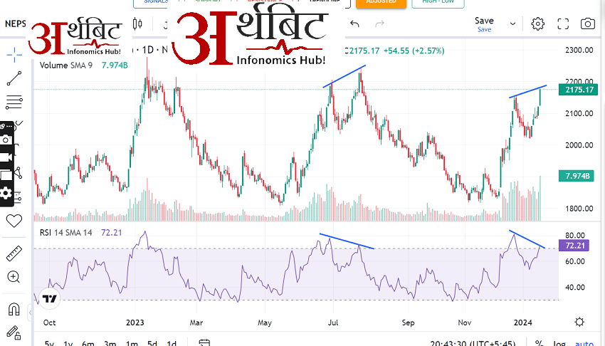 १४ दिने आरएसआइको भ्यालु ७२.२१ रहेको छ जसले बजार सकारात्मक रहेको बताउँछ र थप सकारात्मक हुने अपेक्षा राख्न सकिन्छ । नेप्सेले हिजोको कारोबारबाट आरआएसआइमा डाइभर्जेन्स बनाउन थालेको चार्ट देखिएको छ । तर यो हालसम्म भ्यालिड भएको अवस्था चाहिँ छैन ।